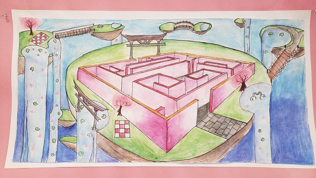 In 8th grade art, students experience a variety of materials and techniques. In this grouping, you will find some examples of visual perspective: one point perspective words and two point perspective mazes. The pencil drawings are an interesting way to use value and blending on a simple contour drawing: students create a linear drawing, then add criss crossing lines over the drawing - this creates new negative and positive spaces. The students use contrast to fill in those spaces with ebony pencil and then smudge it to create a gradual value from light to dark.