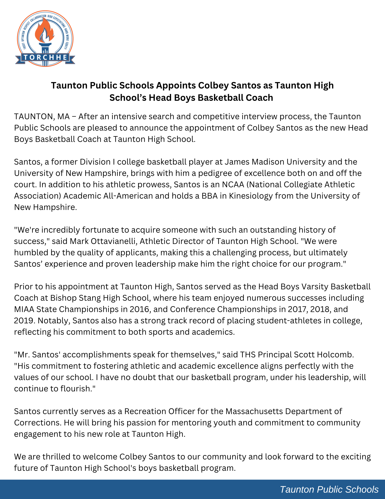 Taunton Public Schools Appoints Colbey Santos as Taunton High School’s New Head Boys Basketball Coach